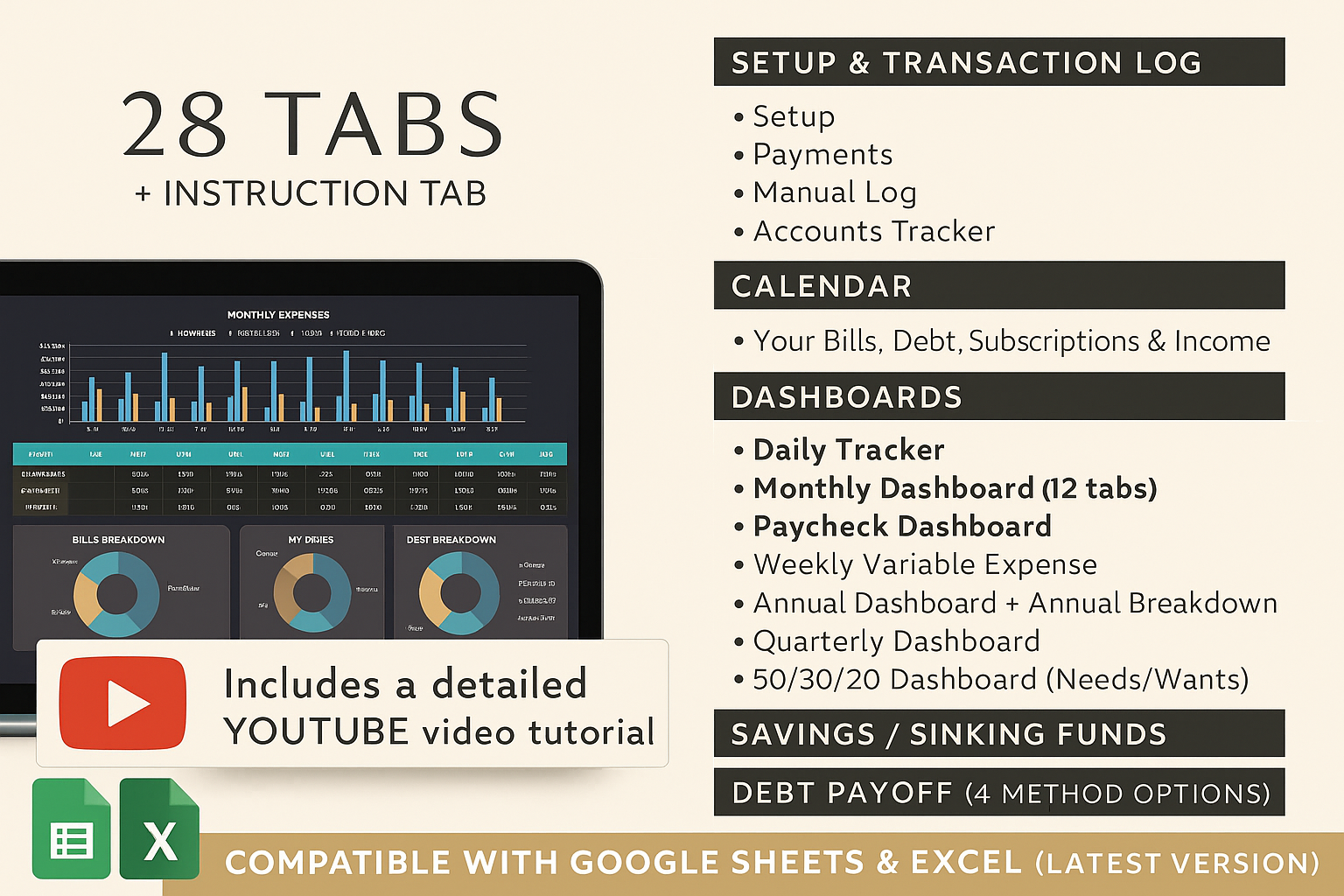 This all-in-one Google Sheets & Excel budgeting template is your ultimate financial sidekick 🦸♀️—designed to help you track, plan, and crush your financial goals with ease and style.