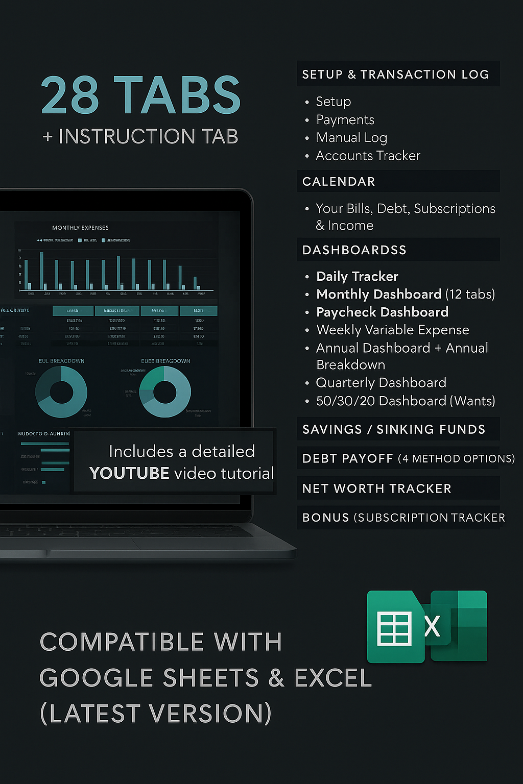 The Ultimate Budget & Finance Spreadsheet is a powerful, all-in-one financial management system designed to help you understand exactly where your money goes, plan ahead with confidence, and build healthier financial habits over time.